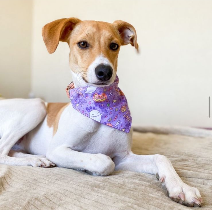 Mía, la perrita de la fotografía está usando una bandana talla S.